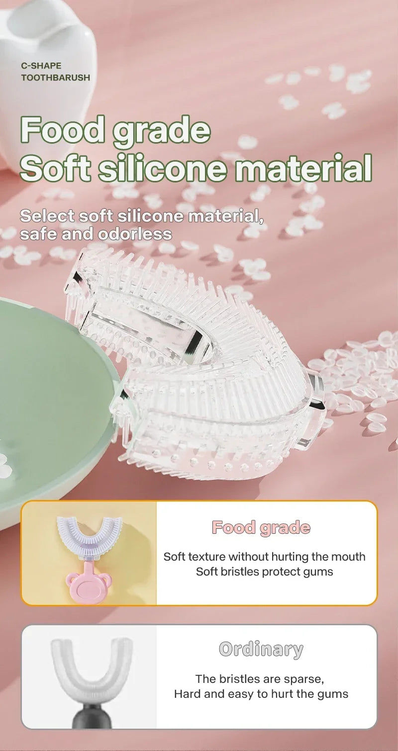 This 360-degree U-shaped toothbrush is designed specifically for children aged 2 to 12 years, providing thorough oral care with its soft silicone bristles. Its ergonomic shape ensures effective cleaning of all tooth surfaces simultaneously, promoting healthy dental habits from an early age. Gentle on gums yet efficient in plaque removal, this brush supports safe and comfortable daily use for young mouths.